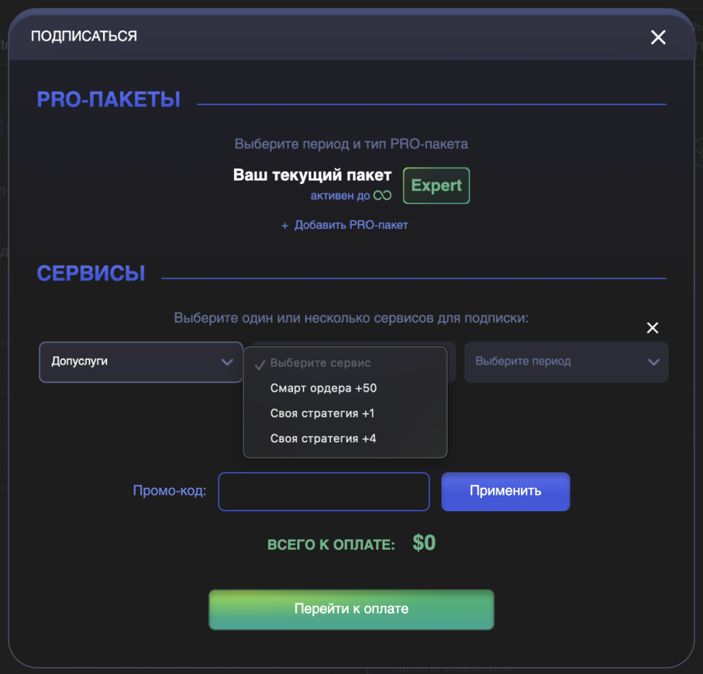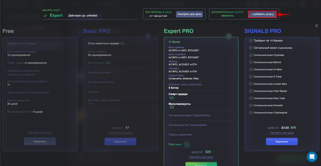 Также услугу можно приобрести отдельно, нажав на кнопку + Добавить услугу в разделе PRO.