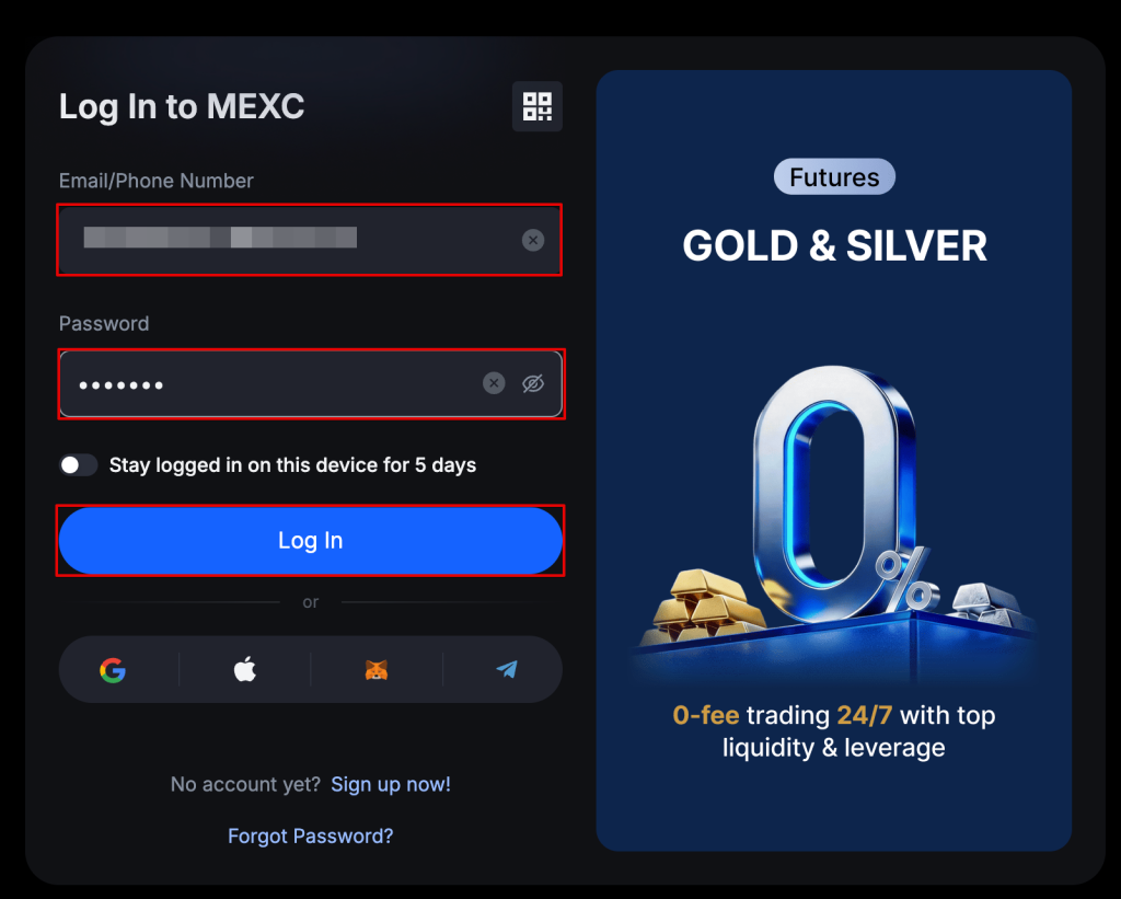 Введите свой логин и пароль от аккаунта MEXC и завершите вход (может потребоваться двухфакторная аутентификация, если она включена).