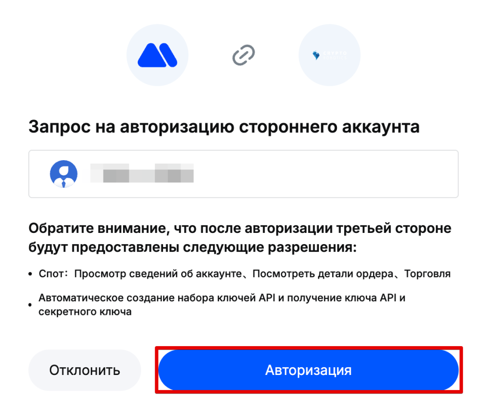 Далее вам необходимо будет подтвердить запрос на авторизацию стороннего аккаунта. Это необходимо для создания API-ключей для торговли на платформе. Вы увидите список разрешений, которые активны для созданного ключа. Для интеграции ключей кликните на кнопку «Авторизация«.