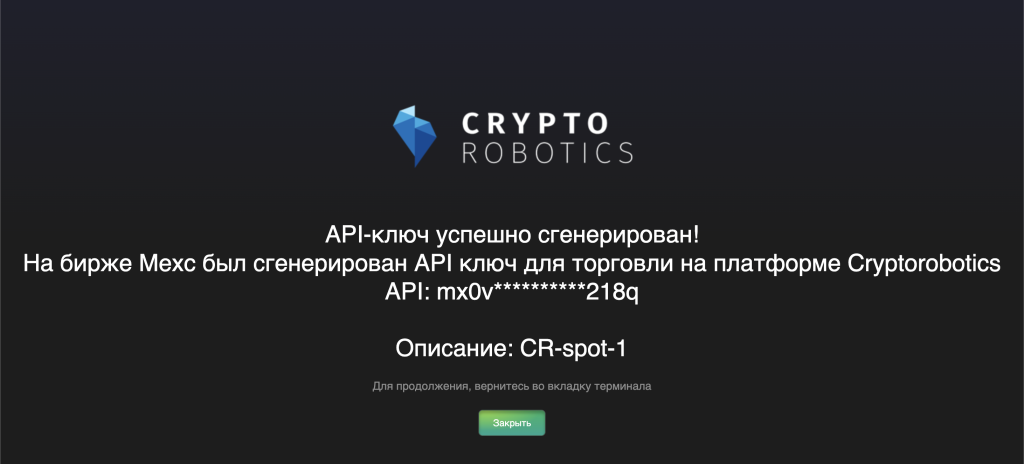 После успешной авторизации система автоматически сгенерирует и сохранит API-ключ для торговли на платформе, и вы будете перенаправлены на окно с сообщением об успешном создании API-ключа. Закройте окно, используя кнопку «Закрыть«.