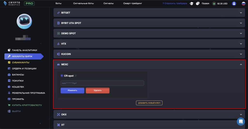 Используйте кнопку ДОБАВИТЬ НОВЫЙ КЛЮЧ в разделе Аккаунт -> Аккаунты бирж.