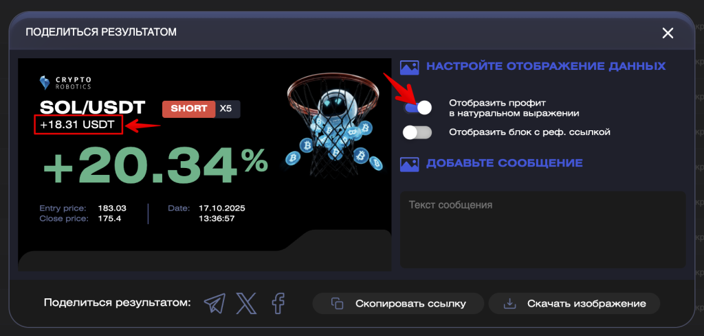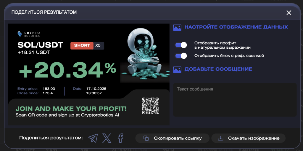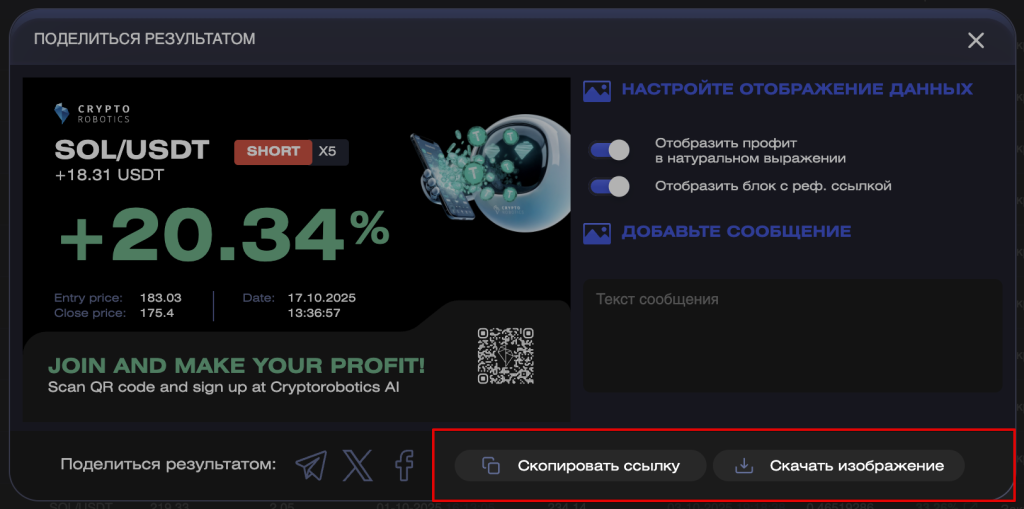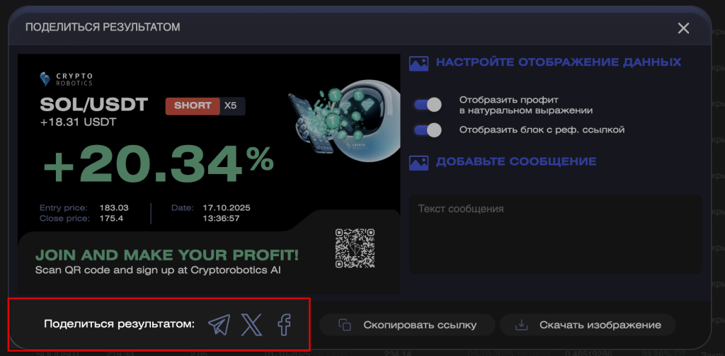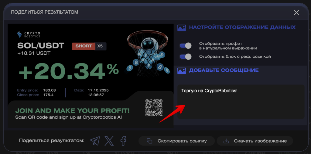 В этой инструкции вы узнаете, как поделиться результатами вашей торговли на платформе.