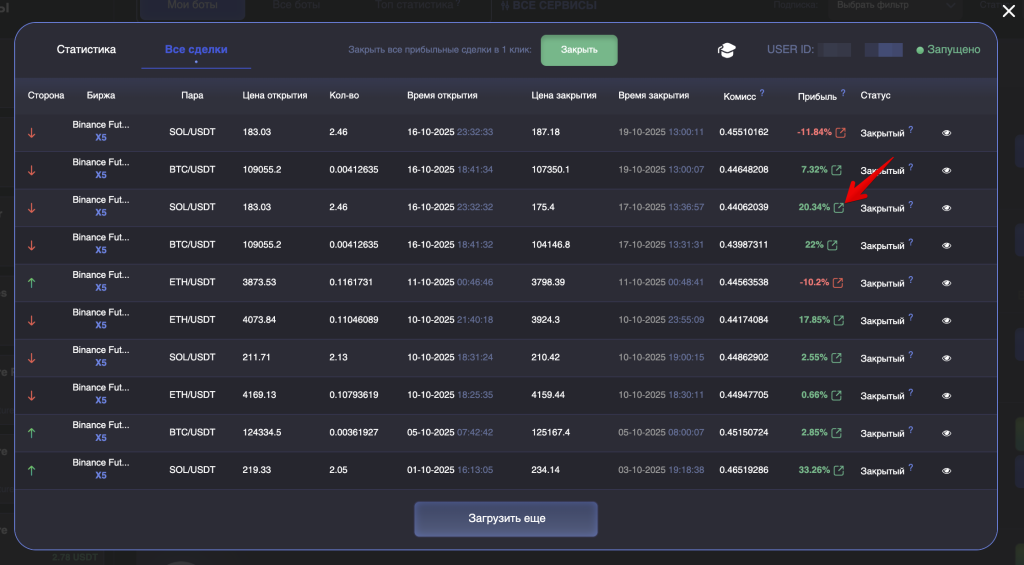 Кнопка в виде стрелки ↗ появляется рядом с процентом прибыли по всем завершенным сделкам.