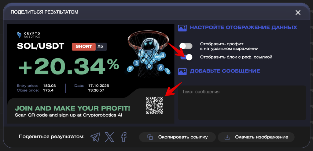 - QR-код с вашей реферальной ссылкой (если вы активировали отображение).