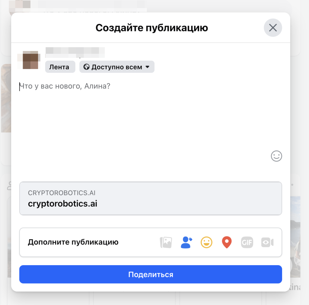 При нажатии откроется окно выбранной платформы с реферальной ссылкой и вашим текстом (при наличии).