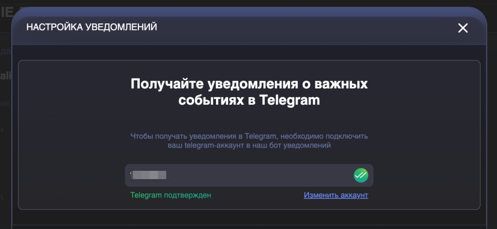 После подтверждения вы увидите статус “Telegram подтверждён”.