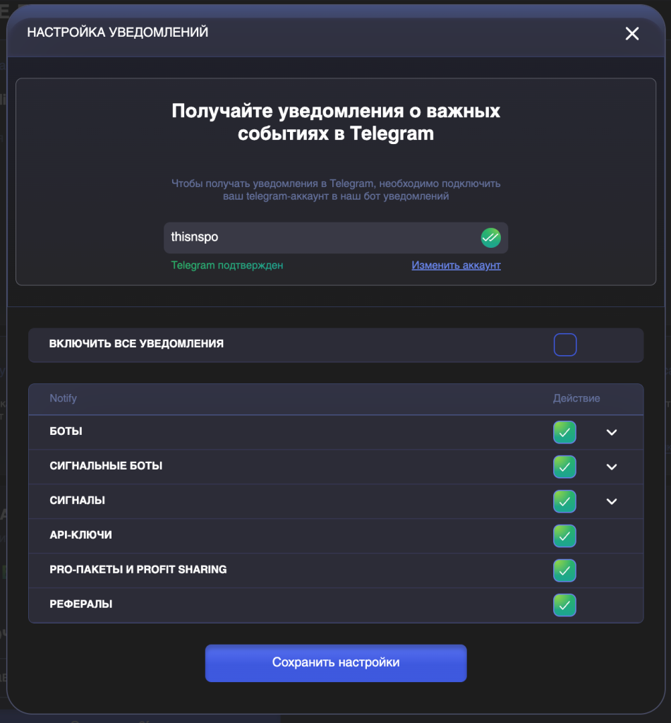 Теперь вы можете получать мгновенные уведомления о важных событиях на платформе прямо в Telegram. Вы будете в курсе таких событий, как открытые и закрытые сделки, ошибки, окончание подписок, уведомления по Profit Sharing и т.д..