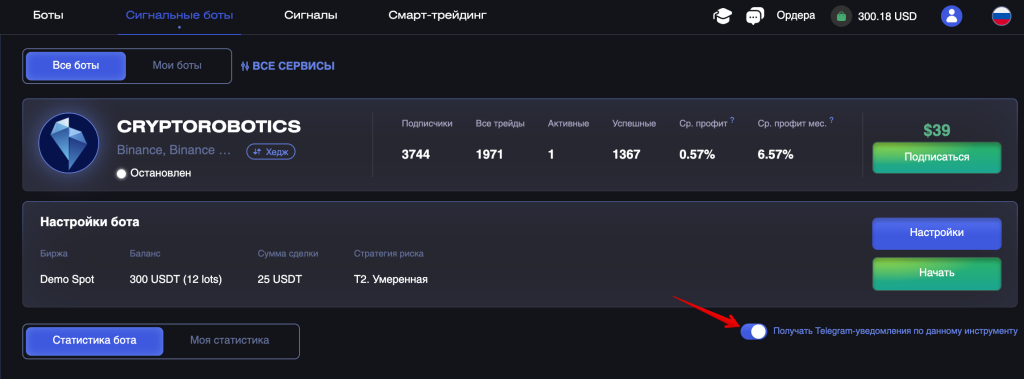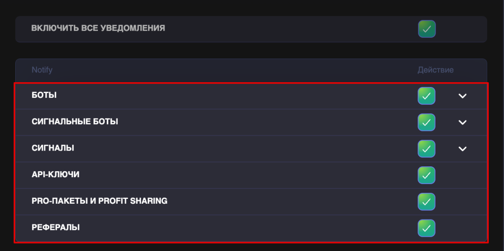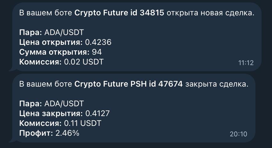 Категория включает уведомления от всех ботов, доступных по подписке, запущенных в демо-режиме или по Profit Sharing.