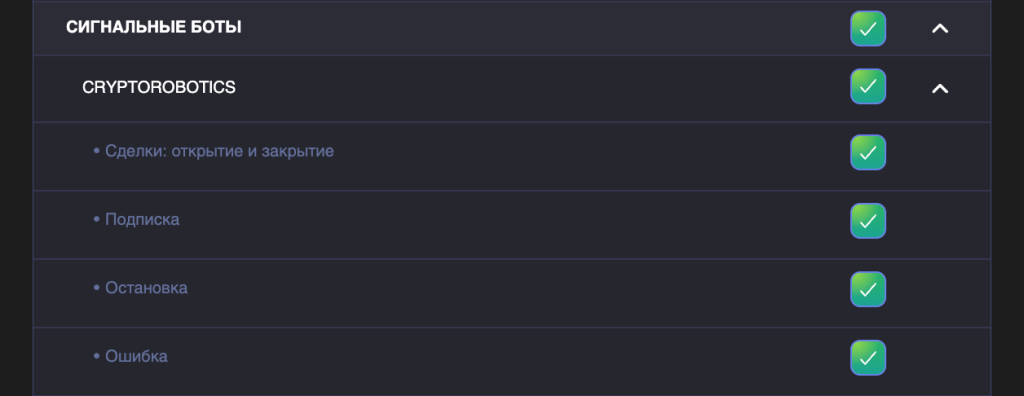 Для каждого бота или сигнального канала доступны подкатегории: